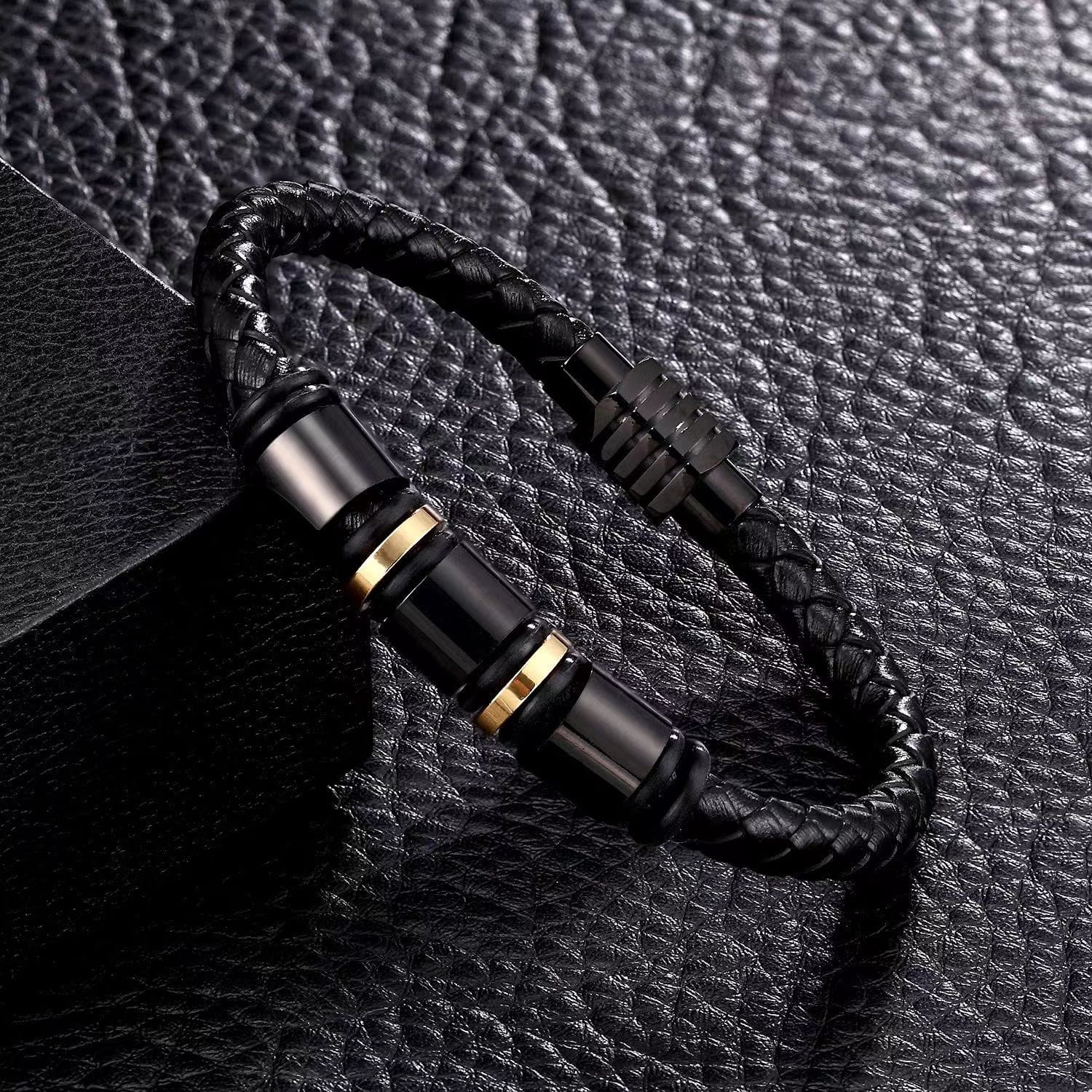Bransoletka Męska Skórzana Rzemyk Czarny Złoty
